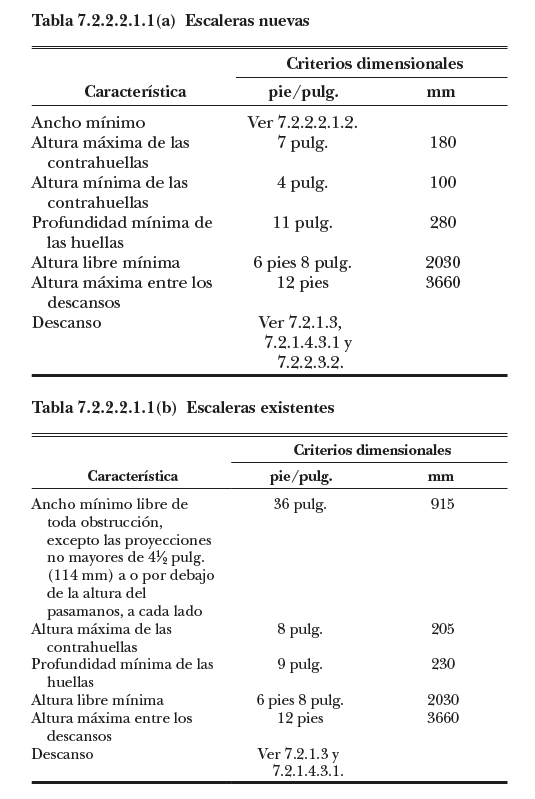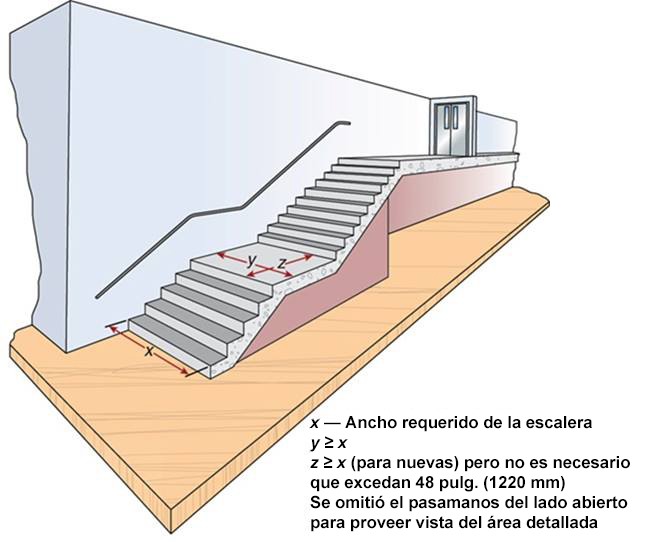 El ancho mínimo de las escaleras nuevas es de 36 pulgadas (915 mm) donde la carga total de ocupantes de todos los pisos servidos por la escalera es menos de 50. Donde las escaleras nuevas sirven una carga total acumulada de ocupantes (asignada a esa escalera) de 50 o más personas pero menos de 2000 personas, el ancho mínimo es de 44 pulgadas (1120 mm) y cuando la carga total acumulada de ocupantes asignada a la escalera es mayor o igual a 2000 personas, el ancho mínimo es de 56 pulgadas (1420 mm).