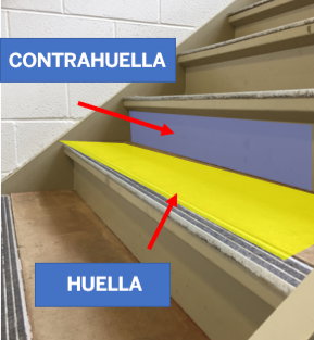 La altura de la contrahuella se mide como la distancia vertical entre los volados de los escalones. La profundidad de la huella se mide horizontalmente, entre los planos verticales de la proyección principal de las huellas adyacentes y en ángulo recto con el borde delantero de la huella. La medición de la altura de la contrahuella y la profundidad de la huella necesita representar el espacio real disponible para quienes usan las escaleras. No puede incluir ninguna parte de la huella que no esté disponible para que alguien coloque el pie. La instalación de revestimientos para el suelo en las escaleras existentes también puede reducir el espacio disponible para su uso en las escaleras.